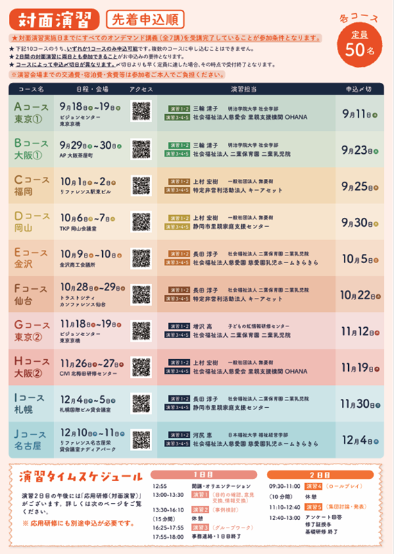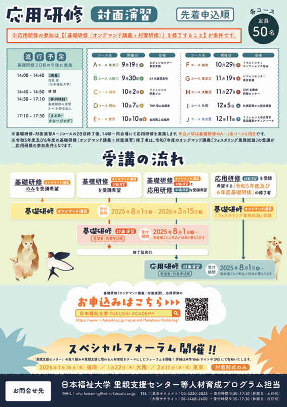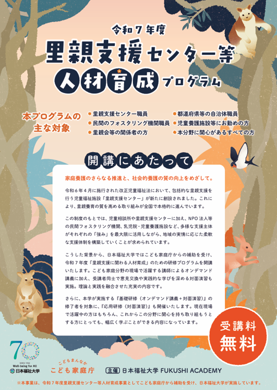 ホーム > 研修案内 >【8月~順次開催】令和7年度里親支援センター等人材育成プログラム 【8月~順次開催】令和7年度里親支援センター等人材育成プログラム 2025年8月20日 令和7年度里親支援センター等人材育成プログラムが開催されます 全国8都市10会場で9月から開催されます。(会場により日程は様々です) 年明けには全国3か所(東京、大阪、福岡)で、スペシャルフォーラムも開催される予定です。 参加申し込みが開始しています。詳細はこちらからご確認ください。 *全国児童家庭支援センター協議会は、本研修への参加を推奨しています* 次の記事へ »